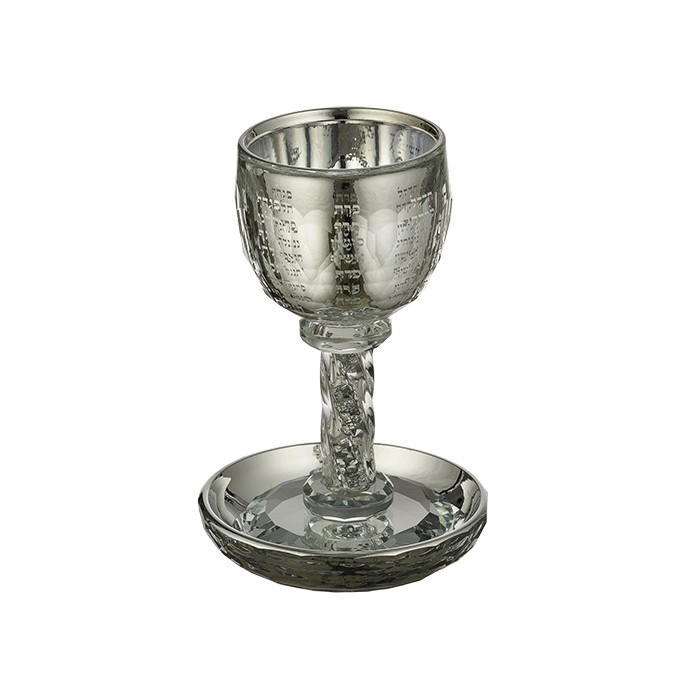 Verre de kidouch à pied et son assiette martelés en inox emmaillé, motif Boré Peri Haguefen.