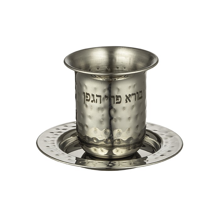 Verre de kidouch à pied et son assiette martelés en inox emmaillé, motif Boré Peri Haguefen.