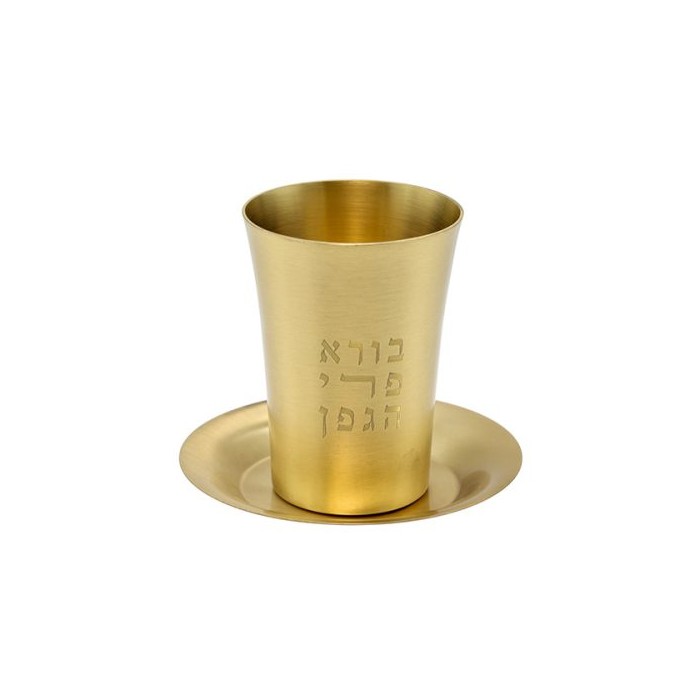 Verre de kidouch et son assiette en inox emmaillé, coloris beige avec motif Jérusalem. Hauteur 8,5cm.