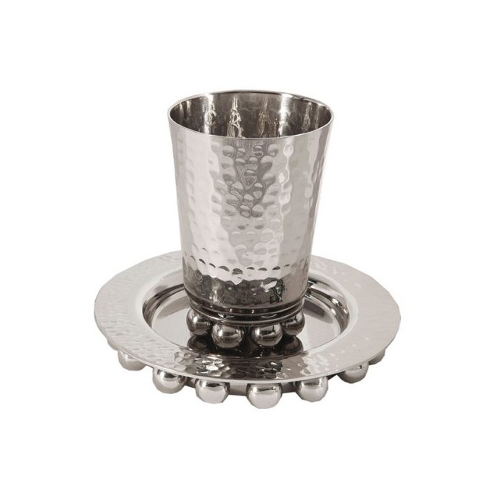 Verre de kidouch et son assiette martelés en inox emmaillé, bande avec inscription Boré Peri Haguefen.
