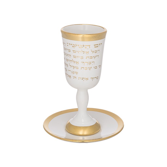 Verre de kidouch en cristal avec pied, ton or, inscription gravée prière du Kidouch. Art Judaica.