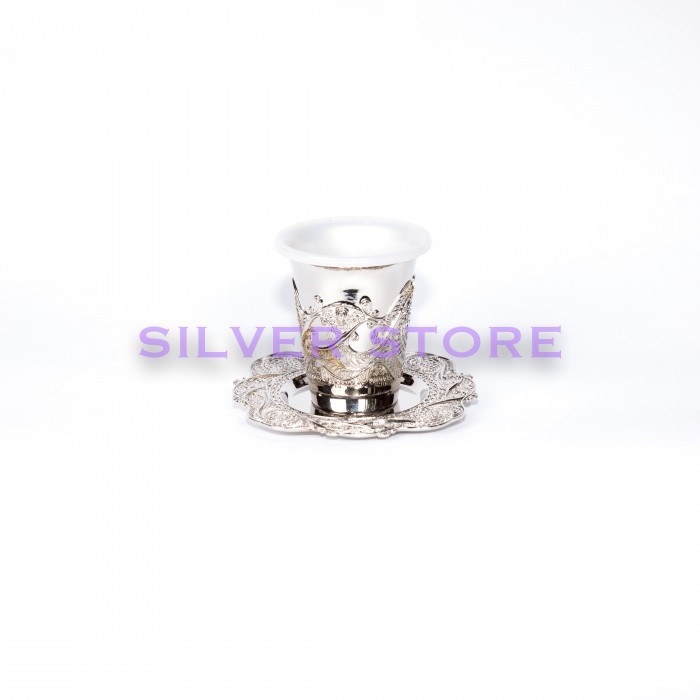 Verre de kidouch à pied et son assiette martelés en inox emmaillé, motif Boré Peri Haguefen.
