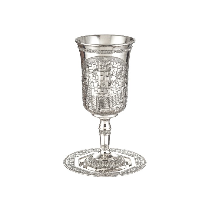 Verre de kidouch à pied et son assiette martelés en inox emmaillé, motif Boré Peri Haguefen.