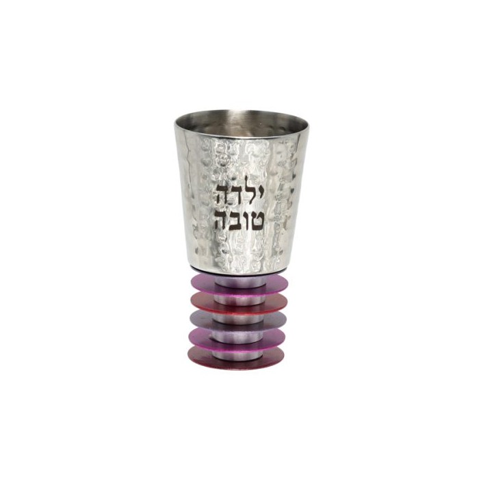 Verre de kidouch à pied et son assiette martelés en inox emmaillé, motif Boré Peri Haguefen.