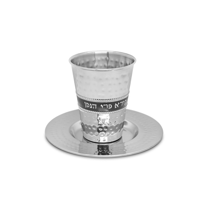 Verre de kidouch et son assiette martelés en inox emmaillé, bande avec inscription Boré Peri Haguefen.