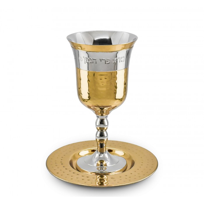 Verre de kidouch à pied et son assiette martelés en inox emmaillé, bande avec inscription Boré Peri Haguefen.