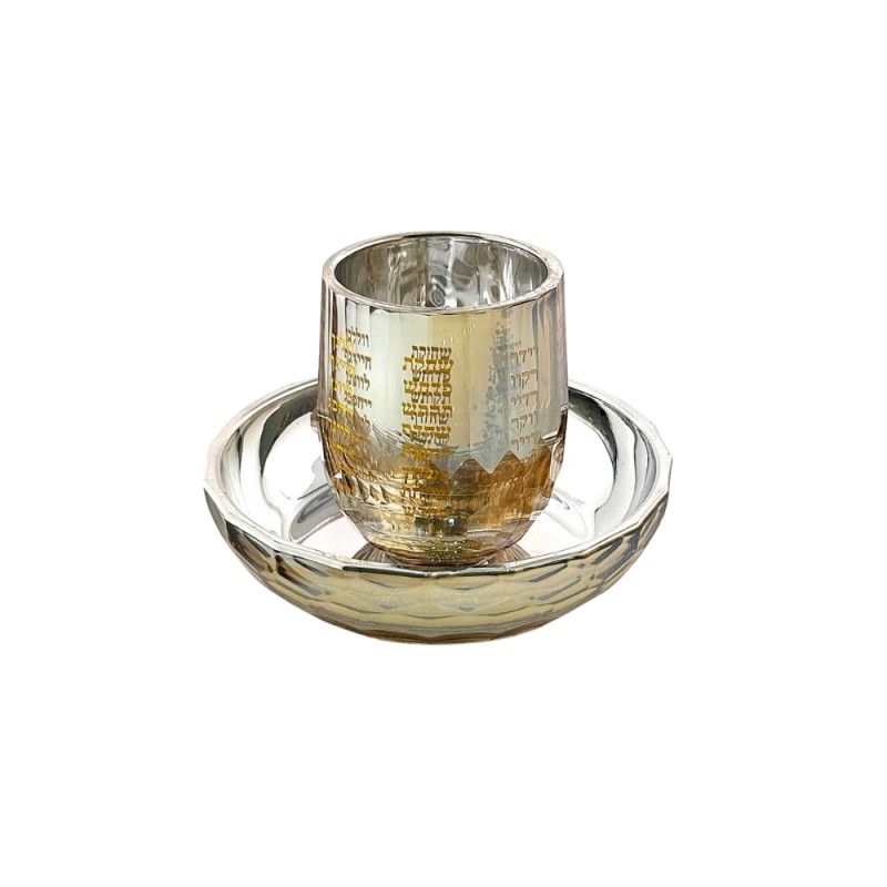 Verre de kidouch et son assiette en inox emmaillé, coloris beige avec motif Jérusalem. Hauteur 8,5cm.