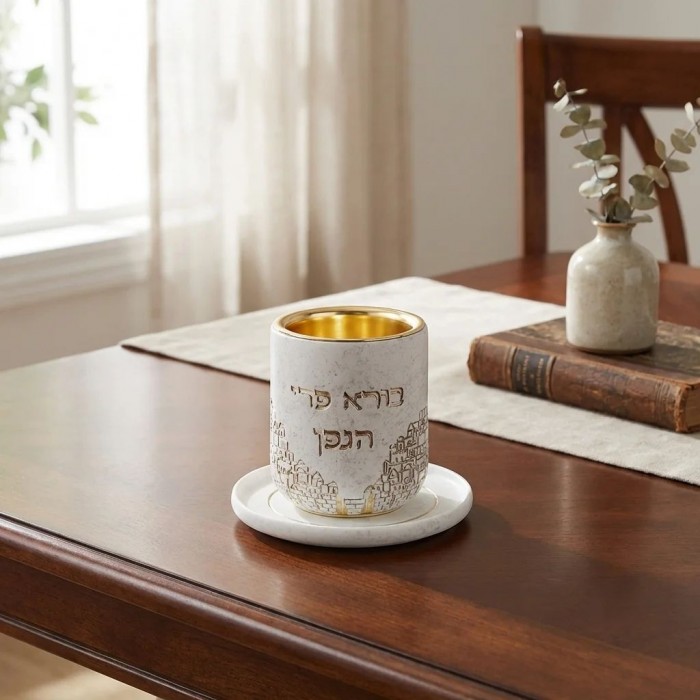 Verre de kidouch à pied et son assiette martelés en inox emmaillé, motif Boré Peri Haguefen.