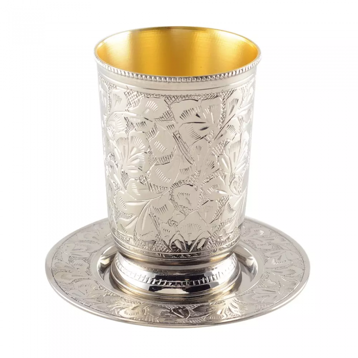 Verre de Kidouch à pied en métal avec motif, noms des fleuves du Gan Eden inscrits.